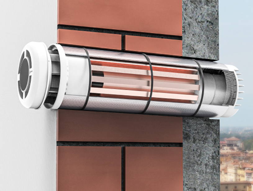 La soluzione tecnica per la ventilazione meccanica controllata si basa su un principio di immissione ed estrazione d’aria su canali paralleli, a ciclo termico continuo, uno scambiatore di calore in rame, che permette di formare due flussi d’aria diretti in senso opposto nel volume di un cilindro.