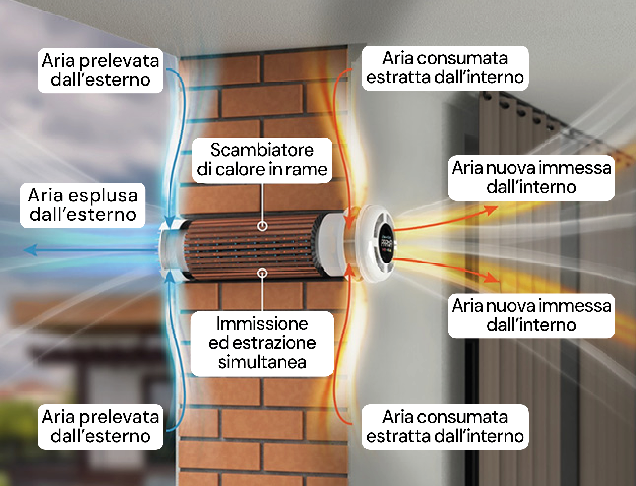 L’aria estratta dall’interno, che viene rimossa dalla stanza, passando attraverso scambiatore di calore in rame, trasferisce la sua temperatura al flusso di aria prelevata dall’esterno.
